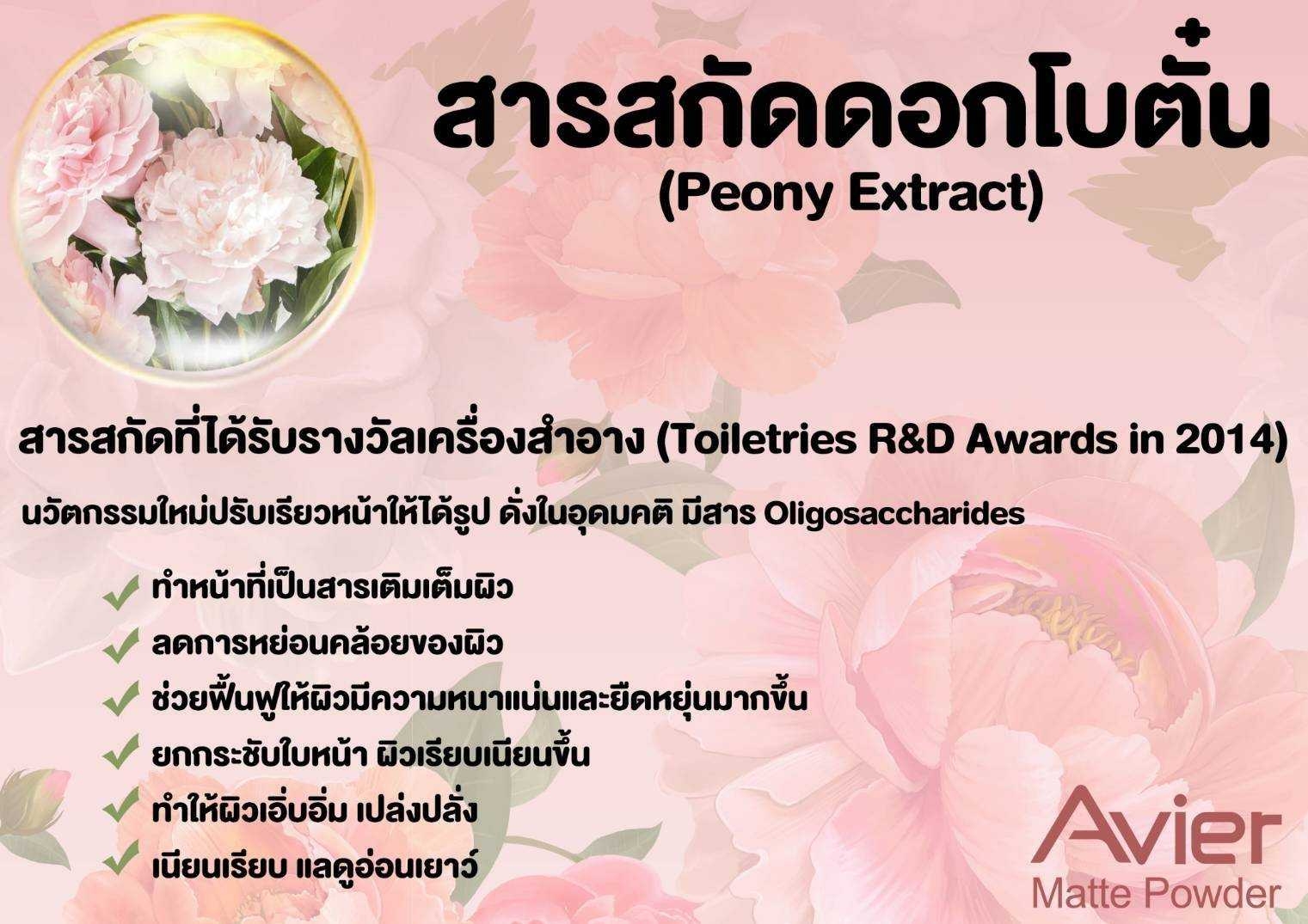 สารสกัดดอกโบตั๋นเป็นสารสกัดที่ได้รับรางวัลเครื่องสำอาง)Toiletries R&D Awards in 2014) นวัตกรรมใหม่ปรับเรียวหน้าให้ได้รูปดั่งในอุดมคติมีสาร Oligosaccharides # ทำหน้าที่เป็นสารเติมเต็มผิว # ลดการหย่อนคล้อยของผิว # ช่วยฟื้นฟูให้ผิวมีความหนาแน่นและยืดหยุ่นมากขึ้น # ยกกระชับใบหน้าผิวเรียบเนียนขึ้น # ทำให้ผิวเอิ่บอิ่มเปล่งปลั่ง เนียนเรียบและดูอ่อนเยาว์
