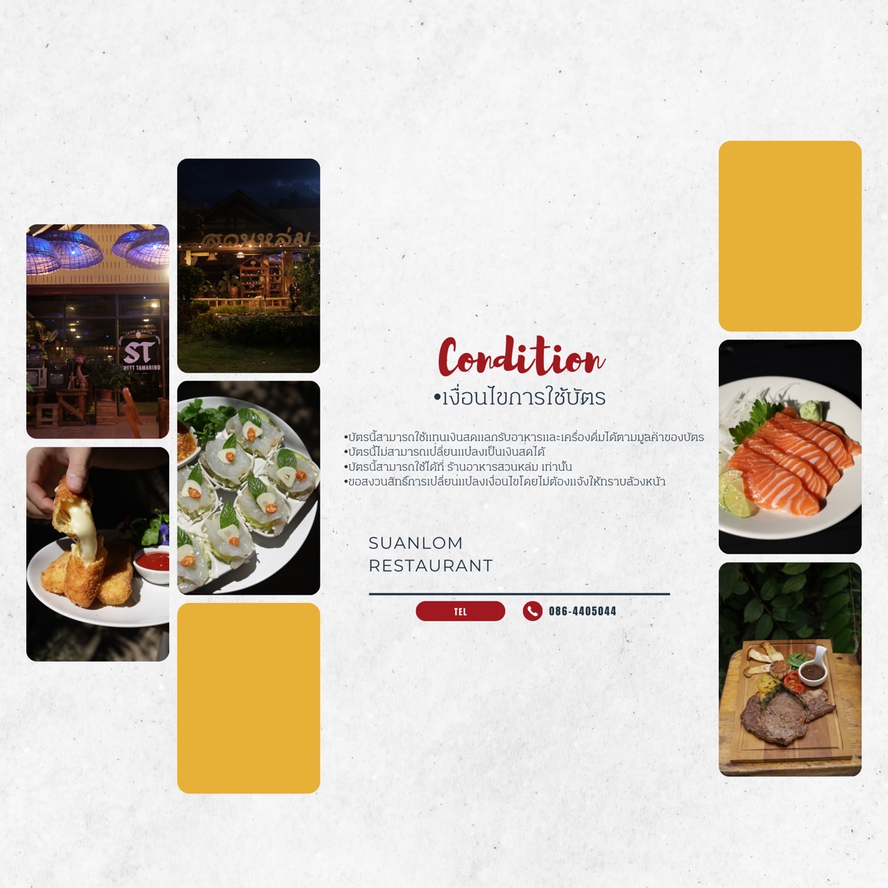 คูปองราคา 1000 บาท เลือกอาหารได้ 1 ชุด ชุดA. หมูกรอบ สันคอย่าง เห็ดหอมทอด ปีกไก่ทอด ไข่เจียวกุ้ง ชุดB. หมูกรอบคั่วพริกเกลือ กะเพราหมูสับ สันคอย่าง ฮ่อยจ๊อ ไข่เจียวกุ้ง ชุดC. ยำแซบหมูกรอบ สันคอย่าง ปีกไก่ทอด กะเพราหมูสับ ลาบเป็ด ชุดD. แซลม่อนซาซิมิ ขาหมูเยอรมัน อาหารทุกชุดเพิ่มปริมาณให้สมกับราคา ฟรี ข้าว 3 จาน น้ำ 3 ขวด น้ำแข็ง 2 ถัง หมายเหตุ นอกเหนือจากอาหารชุดคิดราคาตามเมนู(สแกนจ่ายหน้าร้านได้ตามราคาเมนู) ราคาและปริมาณของสินค้าอาจเปลี่ยนแปลงตามกลไกตลาด ติดตามความเคลื่อไหวได้ที่เพสของร้านอาหารสวนหล่ม https://www.facebook.com/SuanlomRestaurant หรือโทร 0864405044 (ใช้เป็นID Line) นำคูปองนี้มาแลกเป็นอาหารอื่นๆในเมนูของทางร้านได้ตามมูลค่าที่กำหนด