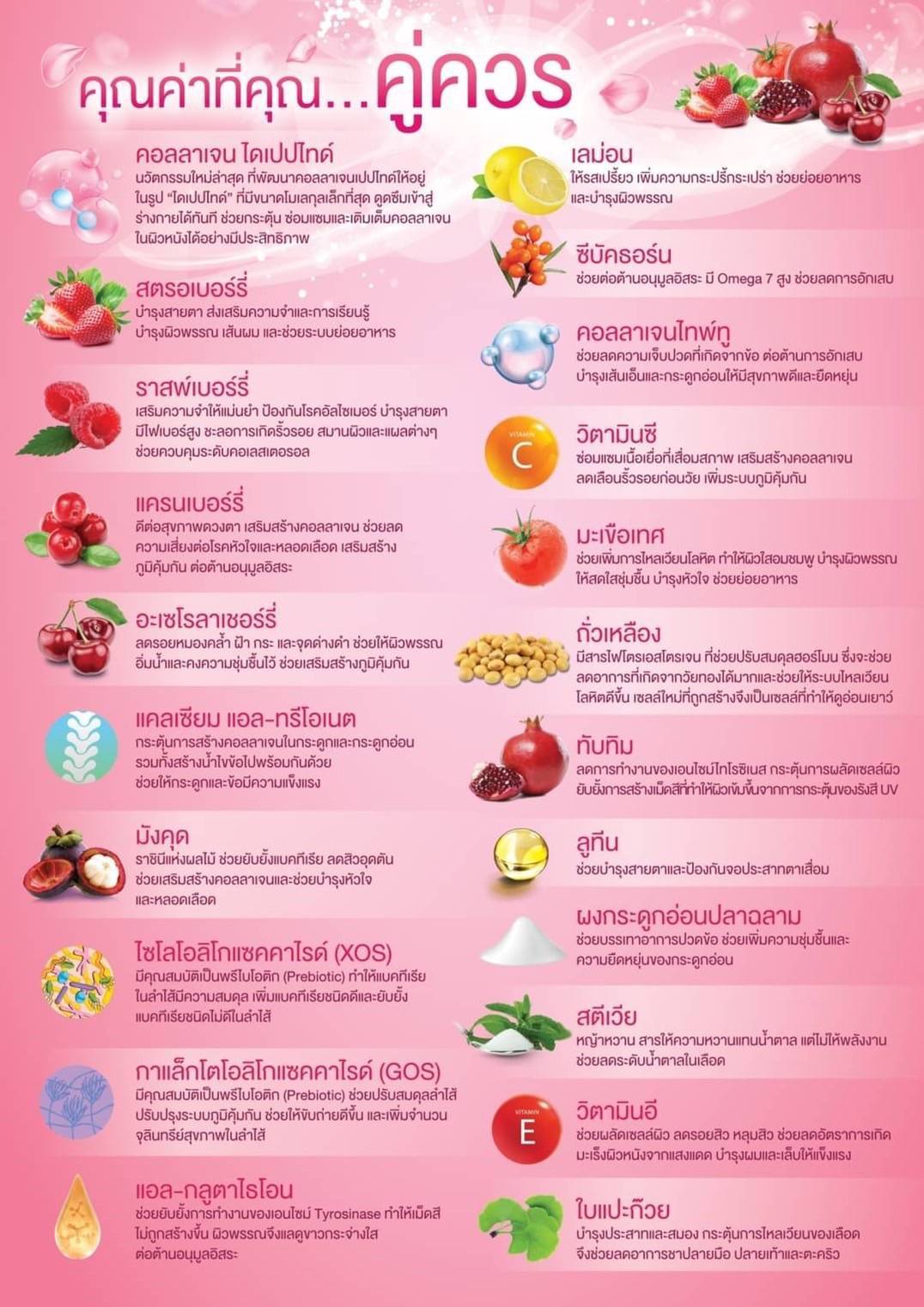 ส่วนประกอบสำดัญ 22 ชนิด 1.คอลลาเจนไดเปปไทด์ 2.สตรอเบอร์รี่ 3.ราสพืเบอร์รี่ 4.แครนเบอร์รี่ 5.อะเซโรลาเชอร์รี่ 6.แคลเซี่ยมแอลทรีโอเนต 7.มังคุด 8.ไซโลโอลิโกแซคคาไรดื (XOS) 9.กาแล็คโตโอลิโกแซคคาไรดื (GOS) 10.แอลกลูตาไธโอน 11.เลมอน 12.ซีบัคธอร์น 13.คอลลาเจนไทพืทู 14.วิตามินซี 15.มะเขือเทศ 16.ถั่วเหลือง 17.ทับทิม 18.ลูที่น 19.ผงกระดูกอ่อนปลาฉลาม 20.สตีเวีย 21.วิตามินอี 22.ใบแปะก๊วย