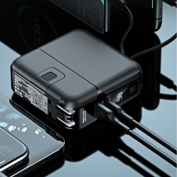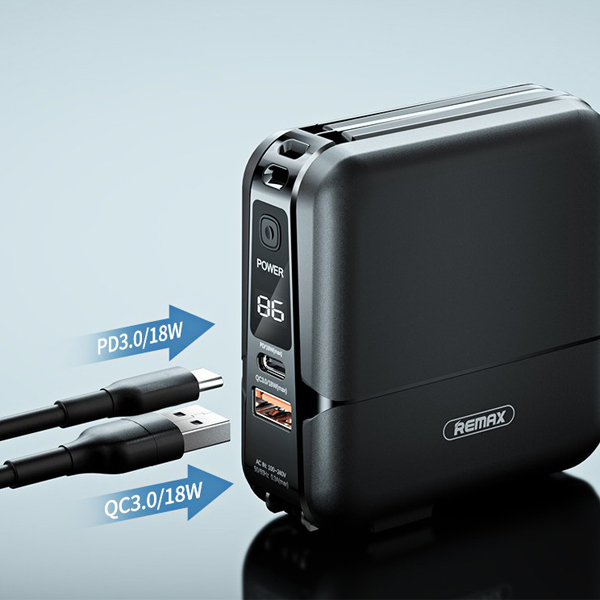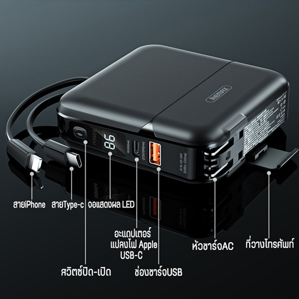 แบตสำรองความจุเต็มจริง 15000 mAh ดีไซน์เรียบหรูดูดีมีสไตล์ วัสดุการประกอบชั้นดี หุ้มอลูมิเนียมและพลาสติกแข็ง มีหน้าจอแสดงผลแบบดิจิตอล รู้ปริมาณความจุ แม่นยำ สวยงามน่าใช้ มีพอร์ตชาร์จที่รองรับระบบชาร์จเร็วทั้ง PD18W + QC3.0 มีสายชาร์จที่พับเก็บในตัวมาให้อีกด้วย ทั้งสาย iPhone (Lightning) และสาย Type-C เป็นแท่นวางใช้ตั้งมือถือ ดูหนัง ฟังเพลง ได้อีกด้วย เป็น adapter มีขาปลั๊กให้ ชาร์จแบตไปในตัวพร้อมกับใช้เป็น adapter ได้พร้อมๆกัน กำลังจ่ายไฟนิ่งและเสถียร มีระบบตัดไฟได้ในตัว