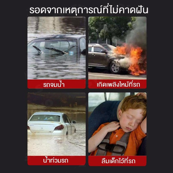 ช่วยป้องกันยามเกิดเหตุฉุกเฉิน เช่น น้ำท่วมรถ รถจมน้ำ เกิดเพลิงไหม้ที่รถ ลืมเด็กไว้ที่รถเมื่อรถล็อกเอง เป็นต้น พวงกุญแจทุบกระจก สามารถทุบกระจกรถให้แตกได้ในมือเดียว มีนกหวีดในตัวเอาไว้ใช้เป่าเรียกขอความช่วยเหลือ มีใบมีดด้านใน ใช้สำหรับกรีดสายคาดนิรภัย มีพวงกุญแจสามารถคล้องกับกุญแจรถได้เลย สะดวกต่อการใช้งานเป็นอย่างมาก ใช้งานง่าย ไม่ยุ่งยาก