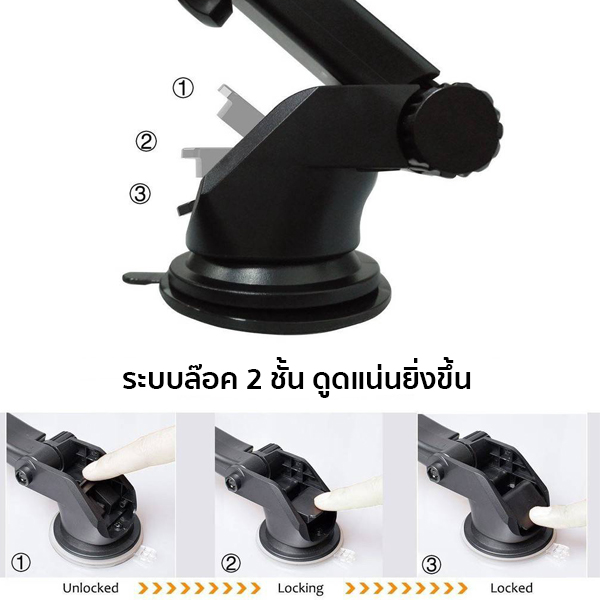 ดูดแน่นติดคอนโซลรถและกระจก ด้วยระบบล็อค 2 ชั้น วัสดุตัวจับเป็นยางพิเศษนิ่มแต่ยึดจับกระชับ ตัวเครื่องไม่เป็นรอย ติดตั้งง่าย ใช้วางบนคอนโซลรถ ติดกระจก ใช้ตั้งมือถือบนโต๊ะได้ ตัวดูดติดกระจกแน่นพิเศษ ปราศจากคราบกาวใดๆ ปรับขนาดได้ตามสมาร์ทโฟนทุกรุ่น ทั้งแนวตั้งและแนวนอน ตัวยึดแบบอัตโนมัติแค่กดและวางมือถือก็ปรับไซต์ได้ทันที หมุนได้รอบทิศทาง 360 องศา ปรับระดับได้ 2 สเต็ป