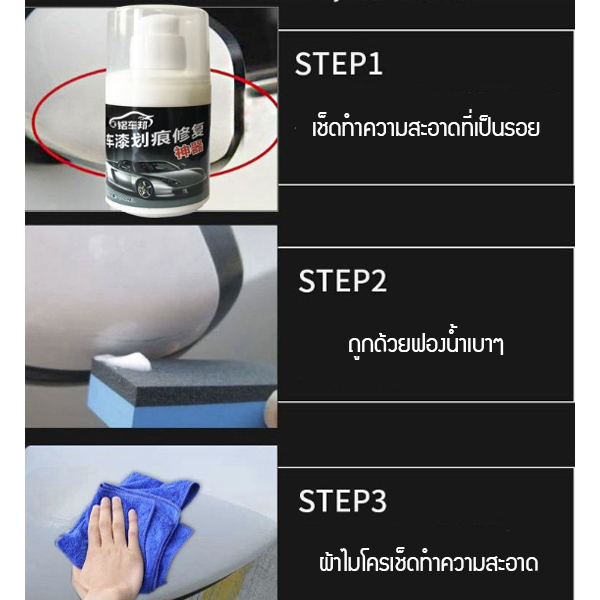 ข้อมูลทางเทคนิค เนื้อครีม: สีขาว ขนาด: 100 ml วิธีใช้ บีบน้ำยาแล้วป้ายที่รอยขีดข่วน หรือคราบสกปรก แล้วใช้นิ้วชี้กดที่ผ้าถูตามแนวรอยได้เลย รอยที่ยังไม่ลึกถึงเนื้อสี สียังไม่หลุด สียังไม่แตก หรือใช้เล็บถูแล้วไม่สะดุด ไม่สาก สามารถเช็ดออกได้เลย หมายเหตุ : รอยเข้าลึกถึงเนื้อสี รอยสีแตกและรอยสีหลุดขัดไม่ได้