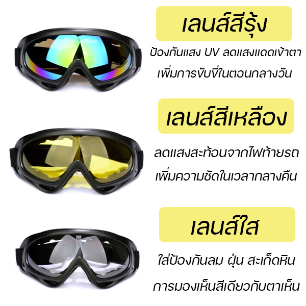 แว่นตากันยูวี บล็อกแสงยูวี 99% ขณะขับขี่มอเตอร์ไซค์ หรือ จักรยาน สายยืดหยุ่นสูง ไม่ขาดง่าย ตัวแว่นสามารถงอได้ ไม่แตกหัก มีฟองน้ำหนาเพื่อให้สวมใส่สบายยิ่งขึ้น ไม่เจ็บเวลาสวมใส่ เลนส์กันรอยขีดข่วน ไม่เป็นรอยง่าย มีช่องลมใต้แว่น ช่วยให้สัมผัสอากาศสดชื่นระหว่างขับขี่มอเตอร์ไซค์ หลากสีให้เลือกคุณสามารถเลือกสีของเลนส์ที่แตกต่างกันสำหรับสภาพอากาศในการขับขี่ที่แตกต่างกัน